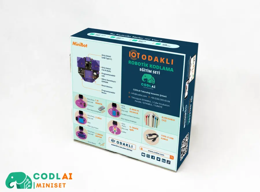 Codlai MiniSet IoT Odaklı Robotik Kodlama Seti, robotik ve STEM dünyasına giriş yapmak isteyenler için özel olarak tasarlanmış, pratik ve eğitici bir IoT başlangıç kitidir. Wi-Fi destekli programlanabilir anakart yapısı ve sensör modülleri sayesinde kullanıcılar, temel elektronik bilgilerini gerçek projelere dönüştürerek öğrenebilir.