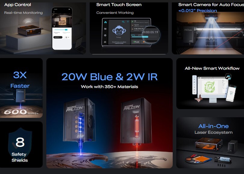 Creality Falcon A1 Pro 20W Lazer Gravür ve Kesici [20W Mavi Diyot (Dahil) ve 2W IR Lazer (Hariç) Başlık Uyumlu ]