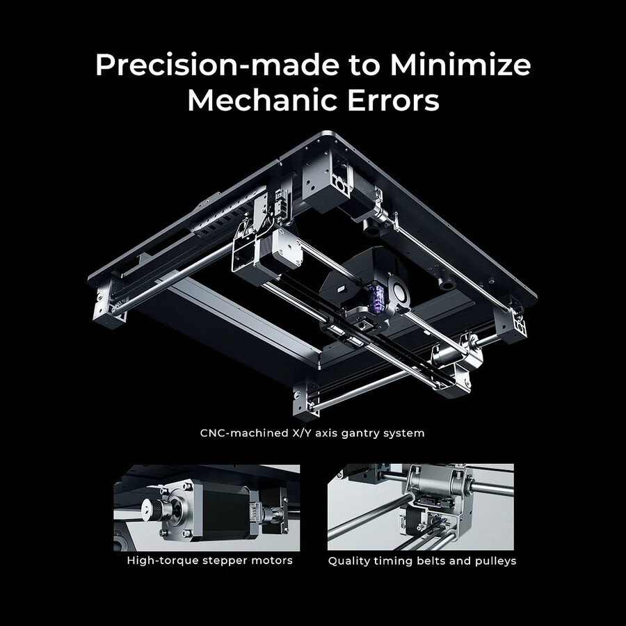 - 12 mm alüminyum alaşımlı yatak tabanıMekanik arızaları en aza indirmek için hassas mühendislik: Hataları unutun: Sermoon D3, özel üretimi sayesinde mekanik hatalar olmadan en yüksek hassasiyeti ve doğruluğu garanti eder! Sermoon D3'ün CNC ile işlenmiş XY eksen portalı 0,01 mm hassasiyetle frezelenmiştir. Yüksek torklu step motorlar ve yüksek kaliteli dişli kayışlar ve kasnaklar da hassas çalışma sağlar!