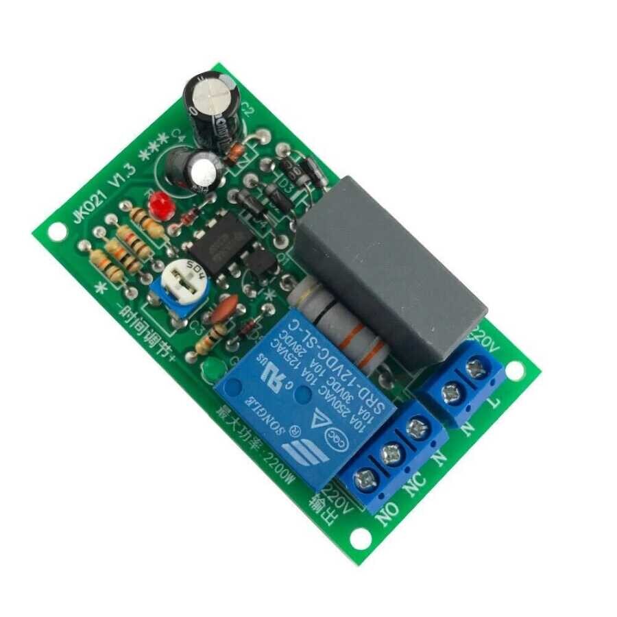 JK021 220VAC Zaman Rölesi, AC 220V ile çalışan ayarlanabilir bir zaman rölesidir. Üzerinde bulunan potansiyometre sayesinde 0–200 saniye arasında süre ayarı yapılabilir. N ve L terminallerine enerji verildiği anda röle devreye girer ve ayarlanan süre boyunca açık konumda kalır.