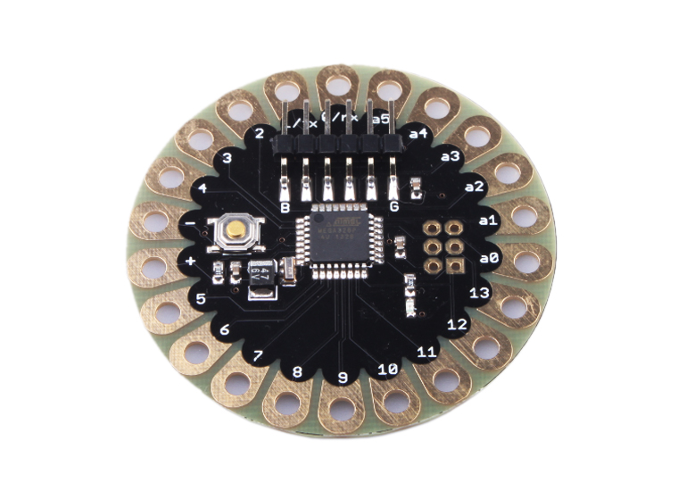 Not: LilyPad Arduino ATmega328 8Mhz Elecfreaks tarafında üretilmiş ve Arduino Lilypad ile tam uyumlu fakat Arduino'ya göre daha ucuz bir geliştirme kartıdır.LilyPad Arduino ATmega328 8Mhz kumaşa dikilebilen küçük bir geliştirme kartıdır. Diğer elektronik modüllere veya komponentlere iletken iplikler ile bağlanabilir. Kartın kendisi sert bir yapıda değildir; belli oranda esneyebilir. Kartı çevreleyen 22 adet gümüşi yaprak benzeri yapı kartın pinleridir. Bu pinlerin her biri (+ ve - pinleri haricinde) karta bağlanan motor, LED, switch gibi komponentleri kontrol eder. Mikrodenetleyici kartın ortasına yerleştirilmiş kare şekilli Atmega328v (datasheet) entegresidir.LilyPad Arduino ATmega328 8Mhz (şematik) diğer Freaduino ve Elecfreaks kartlarda olduğu gibi Arduino IDE kullanılarak programlanabilir. 14 Dijital IO ( 6'sı PWM çıkışı sağlayabilecek şekilde ), 6 analog giriş kart üzerinde mevcuttur ve her bir IO için 40 mA sink/source akımı kart tarafından sağlanabilir.