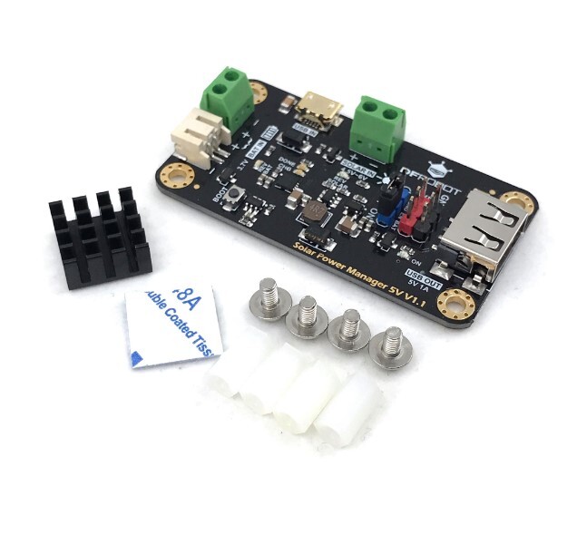 Solar Power Manager 5V, 5V güneş paneli için tasarlanmış küçük güçlü ve yüksek verimli bir güneş enerjisi yönetim modülüdür.