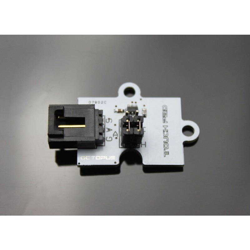 Octopus Touchpad Sensör, TTP223-BA6 kapasitif temas algılama çipi ile oluşturulmuş bir brick kartıdır. TTP223-BA6, 'touchpad'den gelen sinyalleri algılar. Bu entegrenin kullanımıyla klasik basmalı butonlar yerini farklı ebatlardaki 'touchpad'lere bırakmıştır. Düşük güç tüketimi ve geniş çalışma aralığı DC ve AC uygulamalarda öne çıkan özelliklerdir. Octopus Touchpad Sensör basit bir devre tasarımına sahiptir ve 4 çalışma moduna sahiptir. Octopus Touchpad Sensörün 3 numaralı pinine bağlanacak değişken bir kapasitans (0 ~ 50pf arası ve sıcaklık değişim katsayısı düşük olmalı) ile hasssaslık ayarı yapılabilir fakar kart üzerinde bu bağlantı yoktur.