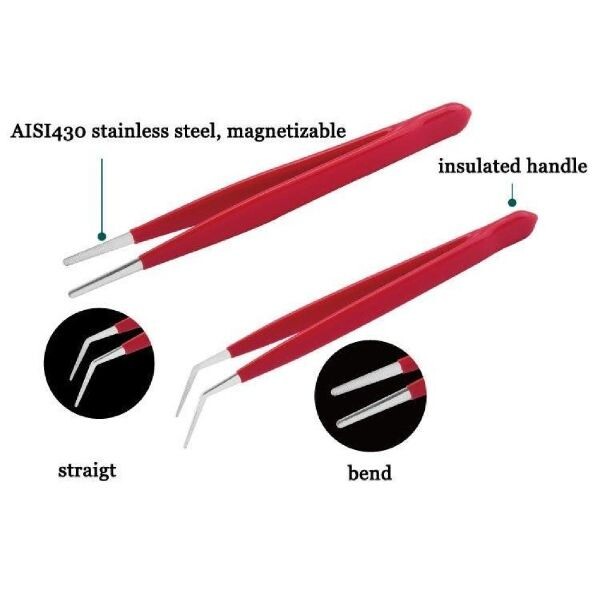 Set içerisinde yer alan düz uçlu ve açılı (bükümlü) cımbız, farklı çalışma açılarına kolayca uyum sağlar. Manyetik olmayan gövde yapısı, hassas elektronik komponentlerde güvenli çalışma imkânı verir. Yalıtkan sap tasarımı, hem konforu hem de kontrollü tutuşu artırır.
