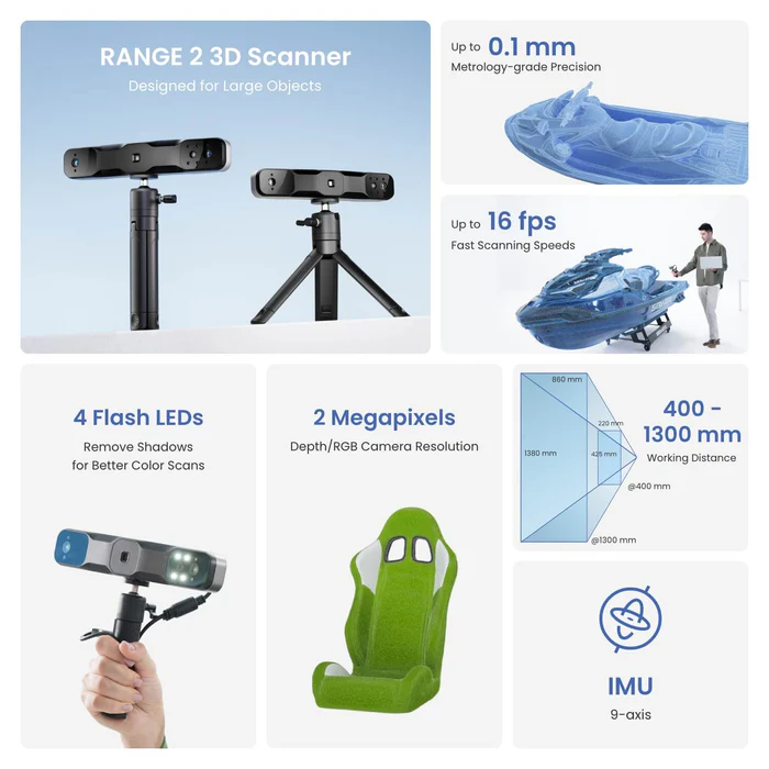 RANGE 2, yüksek çözünürlüklü RGB ve derinlik kameralarını 4 flaş LED ile birleştirerek gölgesiz, net, yüksek çözünürlüklü renkli taramalar yakalar.