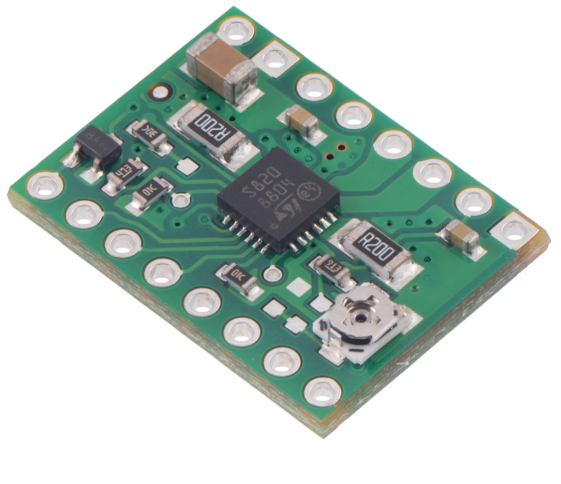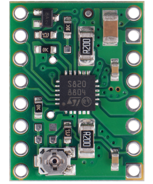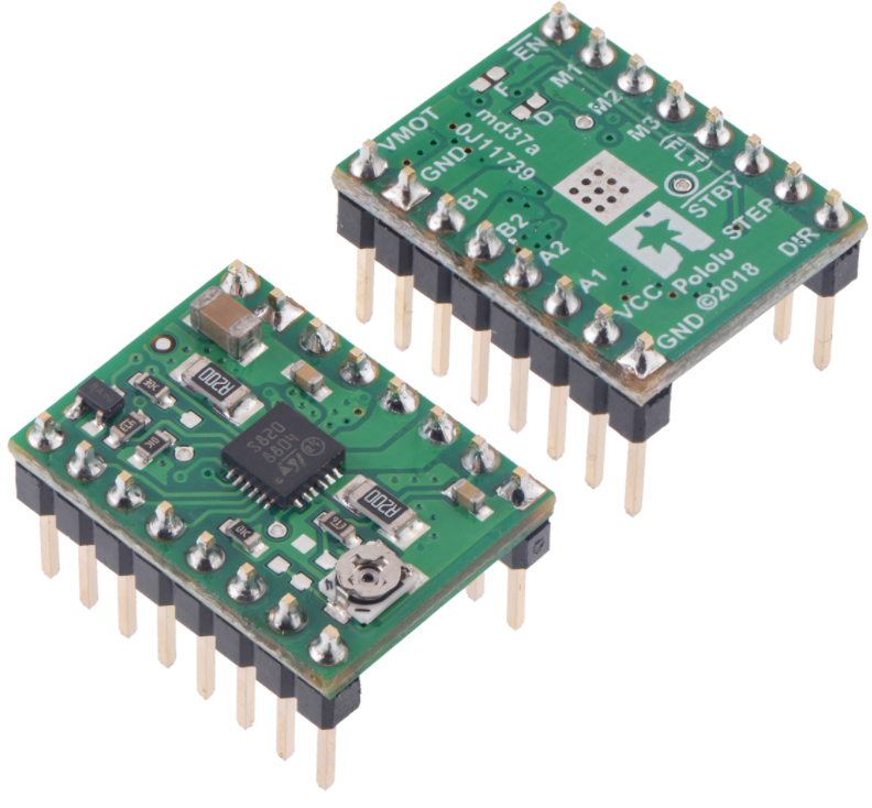 Bu kart STMicroelectronics'in STSPIN820 ICsi ile oluşturulmuş bir bipolar step motor sürücü kartıdır. STSPIN820, 1/256'ya kadar microstepping yeteneğine sahiptir ve 7V ile 45V gibi geniş bir gerilim aralığında 'giriş gerilimi' opsiyonu sunmaktadır. Heat sink olmadan her faz için 0.9A sürekli, 1.5A tepe değerine kadar akım sağlayabilmektedir. STSPIN820 Step motor taşıyıcı kartı pin yapısı olarak piyasada yaygın olarak bulunan A4988'e çok benzer dolayısıyla Pololu'nun bu brekaout kartı A4988 içeren kartlarla direkt olarak değiştirilebilir.
