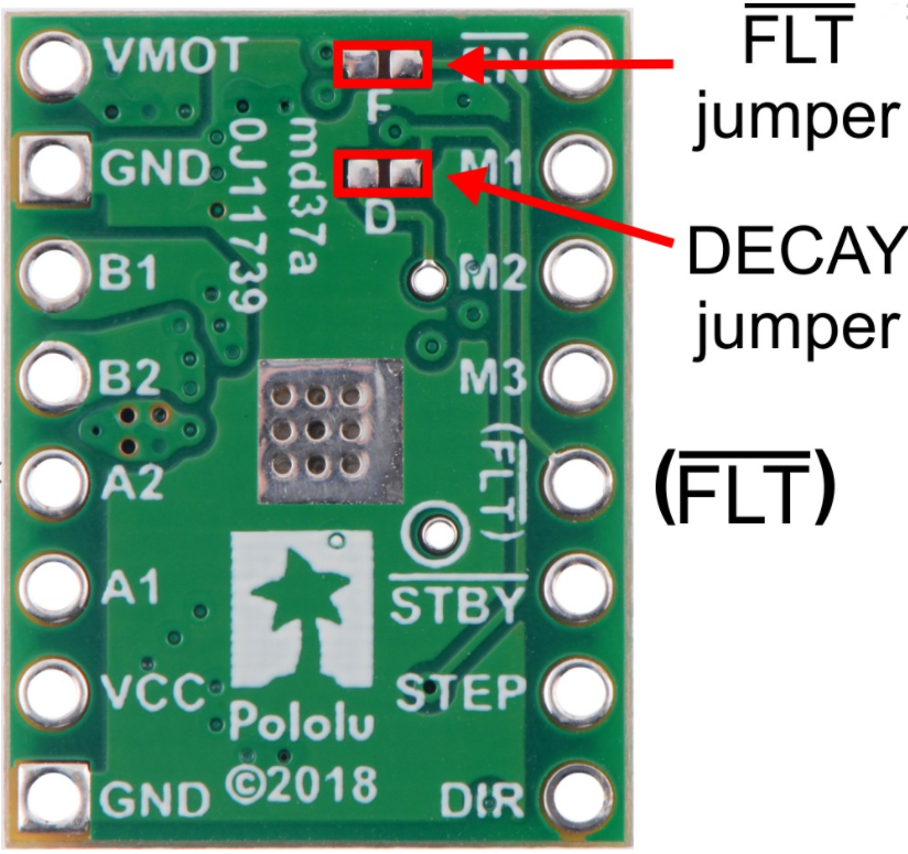 --> Kontrol Girişleri ve Status (Durum) Çıkışları: STEP pinine gelen her bir darbe (pals) yükselen kenarı step motorda bir mikroadıma karşılık gelmektedir. DIR pininden de yön seçilmektedir. STEP/DIR pinleri floating durumdadır ve uygun lojik girişe bağlanmalıdır. STSPIN820 güç durumlarını kontrol etmek için iki giriş vardır: STBY'/RESET pini lojik 'low'a çekildiğinde sürücü düşük-enerji durmuna geçer, çıkışlar inaktif olur, dönüşüm tablosu resetlenir. ENABLE'/FAULT girişi lojik 'low'a çekildiğinde motor çıkışları aktif hale gelir. STSPIN820, hata durumlarını tespit edebilir ve bunu EN/FAULT pinini 'low'a sürerek gösterir. FAULT' pini Pololu'nun diğer step motor taşıyıcı kartlarıyla uyum sağlanması açısından default olarak ulaşılabilir değildir fakat kart üzerindeki jumperlardan FLT' pinine bağlanabilir.