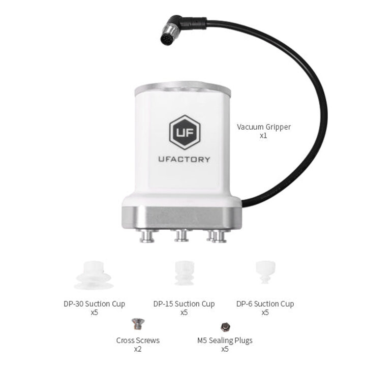 Ufactory xARm vakum tutucu (Vacuum Gripper), 5 kilogramın altındaki nesneleri tutmak için ideal bir uç aparatıdır (son efektör). 5 vakumlama yavasına sahiptir ve tutulacak yüzeyin formuna ve cisim ağırlığına göre sadece bazı yuvalar kullanılabilir. Kolaboratif xArm serisi ile uyumlu olan bu tutucu uç kullanılmayan yuvalar için ttıkama kapaklarına (sealing cup) da sahiptir. Vakum gripper kobot kol ucuna 12 pinli konektörü üzerinden bağlanabilen tak - kullan bir xArm son efektördür.
