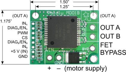 Pololu VNH2SP30 Motor Sürücü Taşıyı kartı, ST'nin H-köprü ile oluşturulmuş ve fırçalı DC motorlarda çift yönlü hız kontrolünü sağlayan VNH2SP30 üzerine kurulmuş bir sürücü taşıyıcı (carrier) kartıdır. VNH2SP30 datasheet'in de tipik bir uygulama için gerekli görülen pull-up dirençleri, akım limitleyici dirençler ve bir FET ters batarya koruma devresi gibi yapılar kart üzerinde oluşturulmuştur.