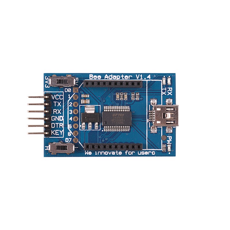 Bee Adaptör, Bee soket (20 pin 2mm) ile donatılmış bir USB-seri adaptörüdür. Kart üzerindeki bir entegre FT232RL IC ile temel Arduino kartlarla haberleşme veya onları programlamak için kullanılabilir. Diğer taraftan BEE uyumlu modülleri kullanarak PCnizi çeşitli kablosuz uygulamalara bağlayabilirsiniz. İncelediğiniz adaptör aynı zamanda Xbee modül araryüzünü de destekler.UYARI: Bee Adaptör V1.0'ı bir programlayıcı olarak kullanmak istediğinizde, hedef güç kaynağınızı kontrol ediniz ve daha sonra 3.3V/5V anahtarını doğru konuma getiriniz.Kullanım: Bee Adaptör genellikle USB-to-serial bir araryüz olarak kullanılır.Bu tarz bir konfigürasyon UART tabanlı ISP'yi destekleyen MCU 'yu programlamak veya MCU seri portu ile haberleşmek için kullanılılabilir. UART pin sırası : VCC , TX , RX , GND şeklindedir.
